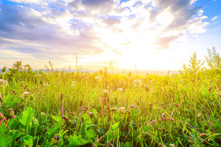 Sunset in the meadow with grass and wildflowers.