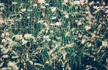 Vintage daisy field in summer, green grass and blooming flowers, chamomile meadow as spring nature and floral background, botanical garden and eco environment