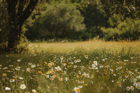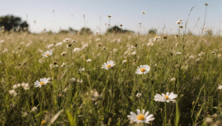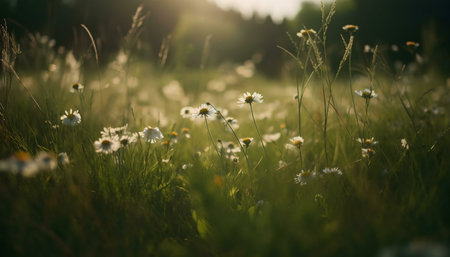 A stunning daisy-filled meadow is illuminated by the warm, golden light of the setting sun, casting a serene and tranquil atmosphere across the peaceful landscape