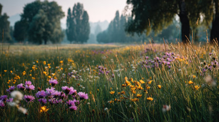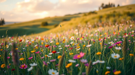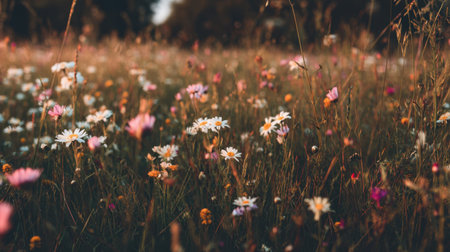 A stunning view of a wildflower meadow at dusk, showcasing a variety of colorful blossoms under soft sunlight. This serene outdoor landscape embodies tranquility and natural beauty.