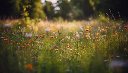 Vibrant wildflowers blossom in tranquil meadow at sunset, nature beauty generated by artificial intelligence