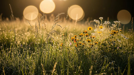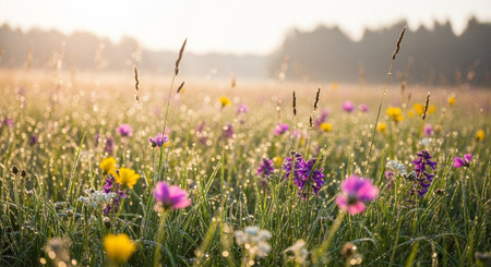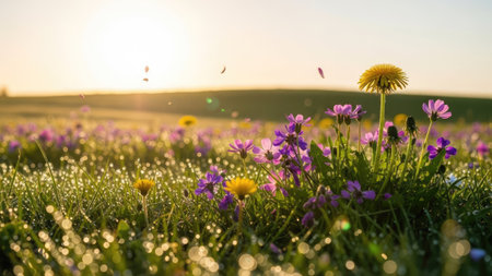 Dewy meadow wildflowers catching the morning light for spring