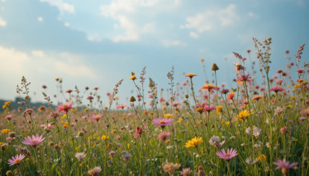 Explore the enchanting beauty of a wildflower meadow filled with colorful blooms, embodying the essence of nature and tranquility under a soothing blue sky.