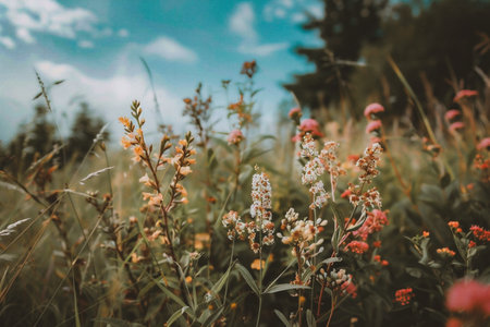 summer meadow with wild flowers and blue sky - retro vintage effect