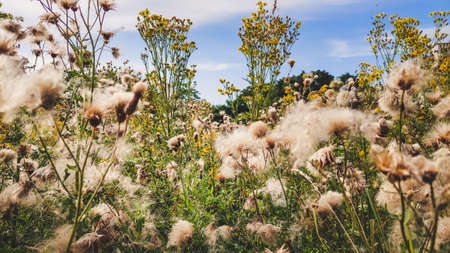 Low angle view into the flower field with creeping thistle in foreground during late summer. Beauty in nature.