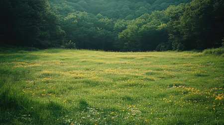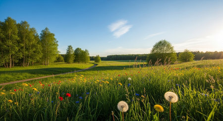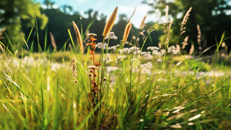 Generative AI : Bloom meadow field wild grass against green field in nature outdoor wide format