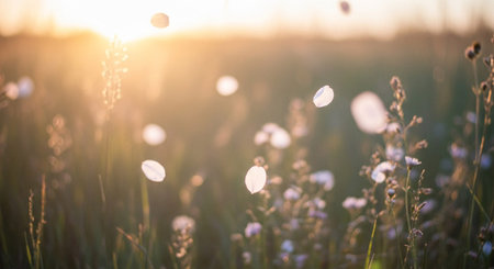 Soft focus meadow at golden hour with sunbeams illuminating falling white petals and delicate wildflowers.