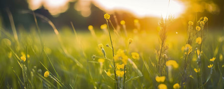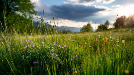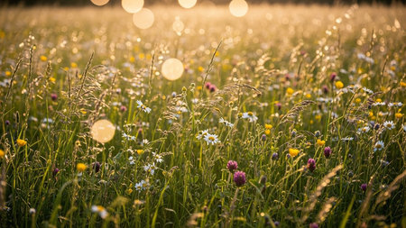 Tall green grass and wildflowers in a sunlit meadow are bathed in warm golden hour light, creating a serene natural...