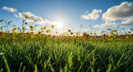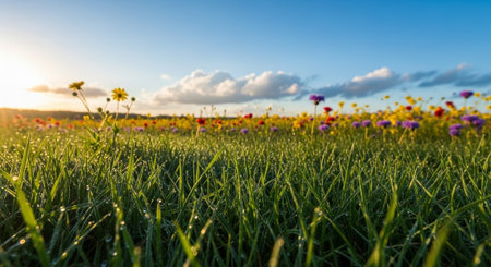 Sunlit meadow with vibrant wildflowers and dew-kissed grass