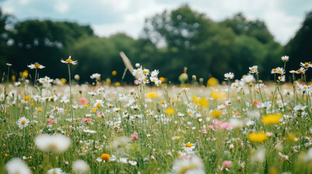 Close-up view of a summer meadow filled with delicate wildflowers and grasses, creating a natural and rustic atmosphere.