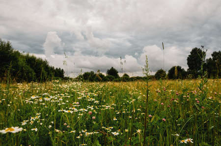 Large forest lawn with blooming daisy and clover flowers during rainy summer morning.