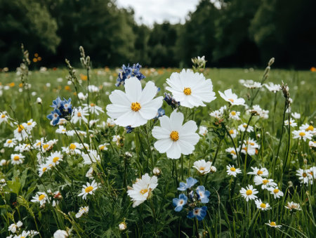 White cosmos and daisies in a field