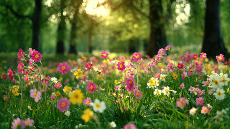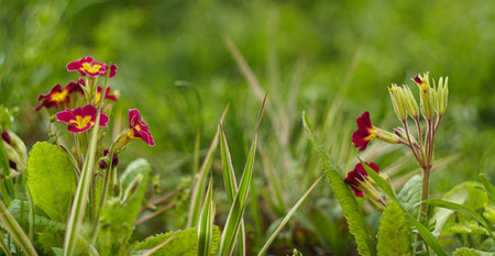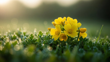 Delicate yellow primrose flowers emerge from lush green foliage in a sun-drenched meadow, with a soft, blurred...