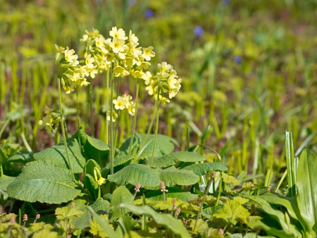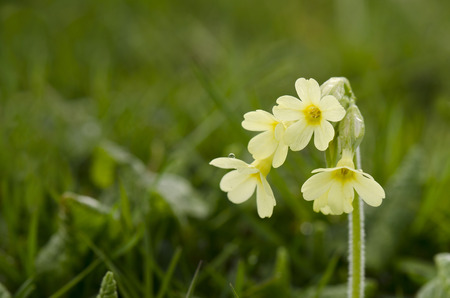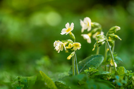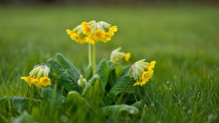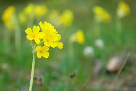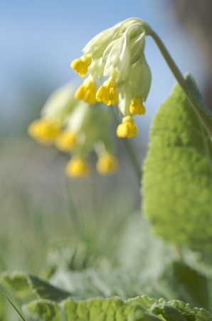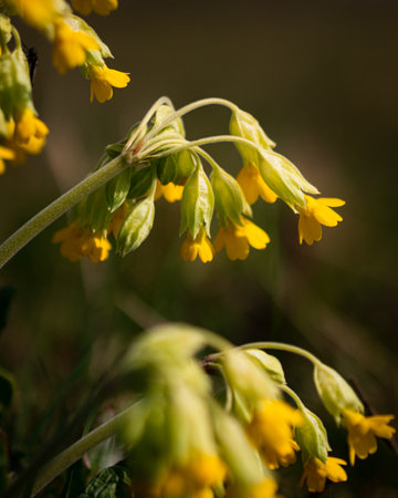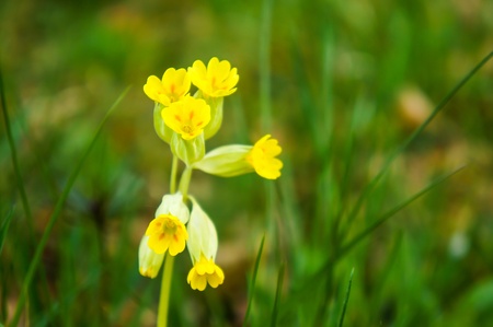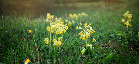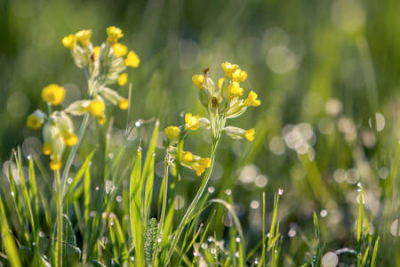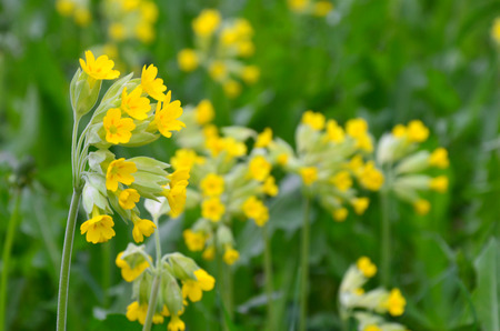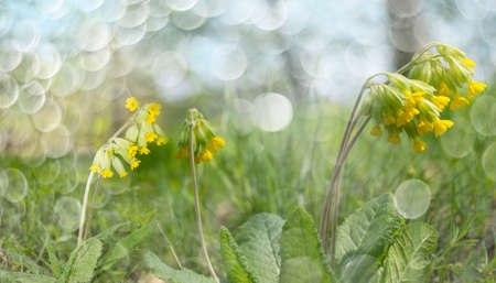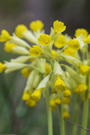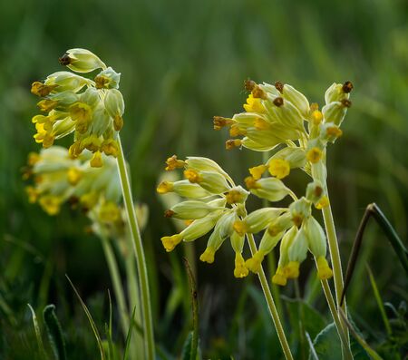 Low angle shot of some cowslip flowers in natural blurry green ambiance