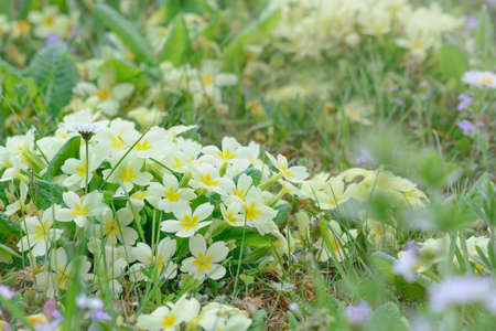 Multicolor Primrose or primula vulgaris first spring flowers in spring garden