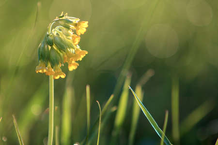 Beautiful yellow common cowslip, cowslip primrose, primula veris, on soft green blurred background, selective focus