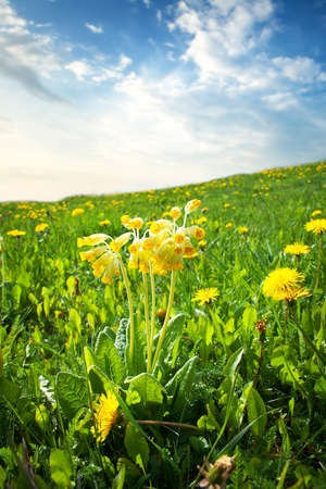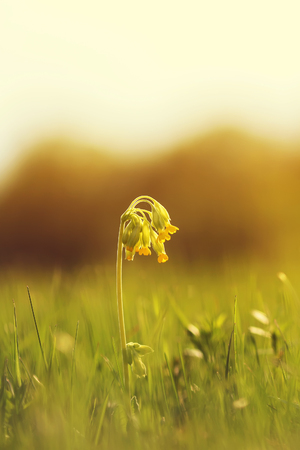 Springtime.Sunny spring scene with blooming yellow flowers of cowslip (Primula veris) Vintage colors