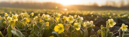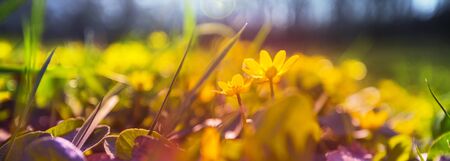 Primroses Field On Blurred Sunrise Background. Banner For Web