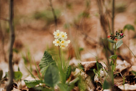 Beautiful spring yellow primrose (ox lip) flower growing in forest. Taken at sunset, low sun light.