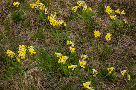 A group of common cowslips (Primula veris) on a meadow, early spring in Austria