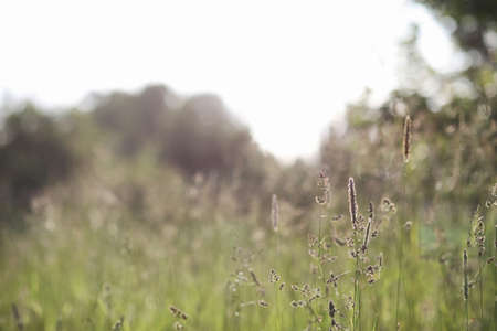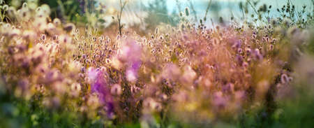 Meadow flowers and grasses illuminated by the warm sun on a summer field, an abstract bright natural background for your design.
