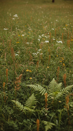 A close-up view of a vibrant green meadow filled with various wildflowers, grasses, and fern fronds bathed in soft, natural light.