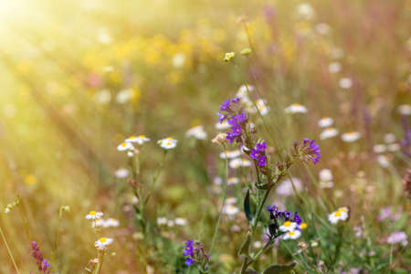 Wild flowers in the meadow with sun rays.. Summer wildflowers in nature.