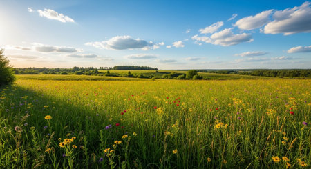 Scenic landscape with vibrant wildflowers in a sunny field, showcasing the beauty of nature and tranquility, ideal for spring and summer themes