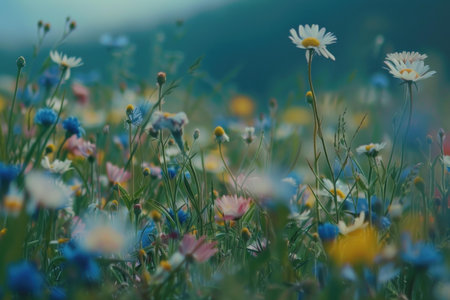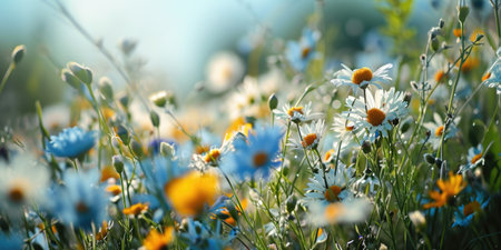 A close-up view presents a meadow filled with wildflowers under a blue sky. White daisies and other blossoms in various colors dominate the foreground. The composition highlights natural textures and soft lighting, suggesting a tranquil outdoor setting. Ideal for illustrating concepts such as nature and spring.