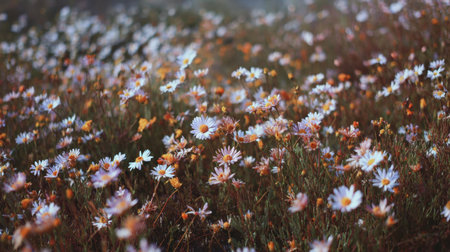 Vibrant field of wildflowers showcases beautiful array of white and orange blooms, creating serene and picturesque landscape. delicate petals and lush greenery evoke sense of tranquility