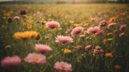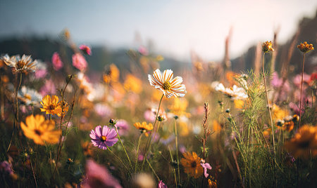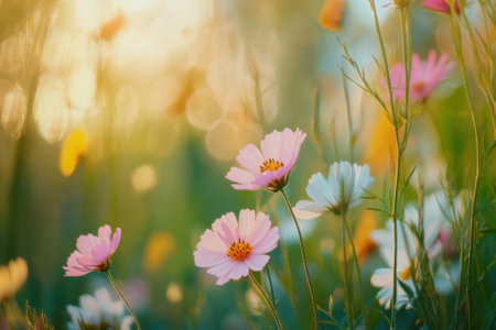 A field of colorful wildflowers is bathed in warm sunlight. The composition highlights a variety of blooms in yellow, pink, and white. Textures and soft focus create a sense of depth, suggesting an outdoor environment. Suitable for editorial and commercial projects.