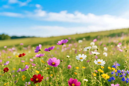 Explore the enchanting beauty of a wildflower meadow filled with colorful blooms, embodying the essence of nature and tranquility under a soothing blue sky.