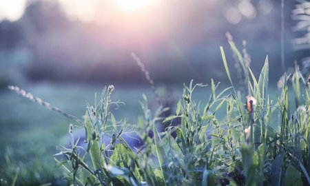 Sunset or sunrise over a green field with grass and flowers, natural background
