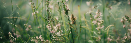 A close-up image of wildflowers and grasses in a meadow. The flowers are in bloom, with delicate petals and vibrant colors.