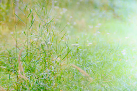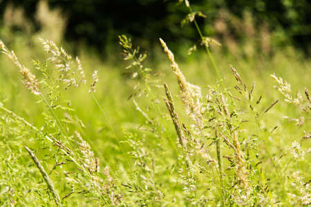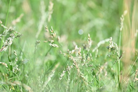 Decorative background bright light bluegrass, meadow grass in selective focus