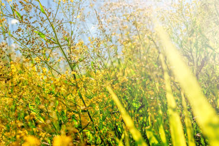 Wild yellow flowers, plants grasses natural background. Rural summer countryside landscape great depth of field. Dark green floral backdrop soft focus
