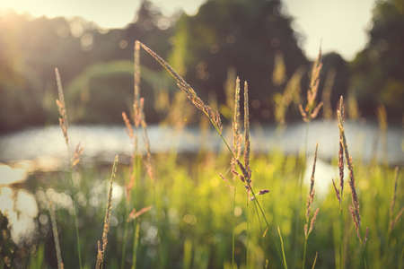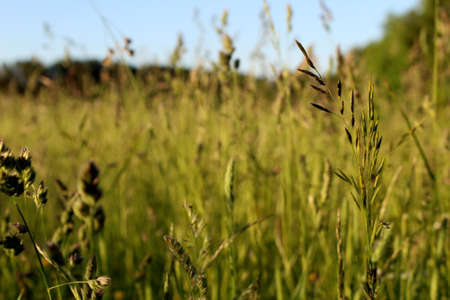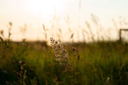 Field with wild grasses at sunset. Selective focus. Beautiful summer landscape, rural nature.