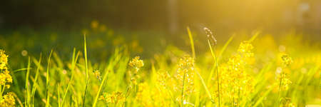 Defocused Spring field sunset rapeseed flower background, copy space. Summer sunset, yellow meadow. Web banner