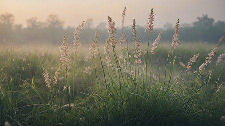 Morning sunlight illuminates tall grass and wildflowers in a tranquil meadow at dawn