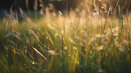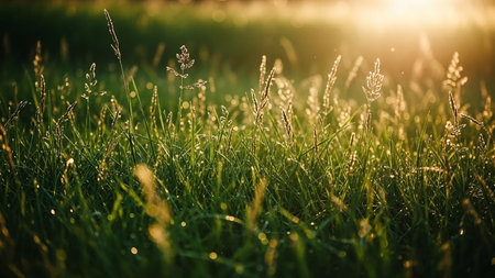 Tall green grass and wildflowers in a sunlit meadow are bathed in warm golden hour light, creating a serene natural...