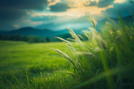 Details with green grass under heavy wind in the dusk light of a spring day.