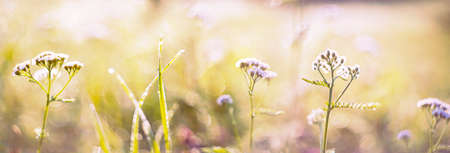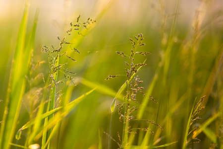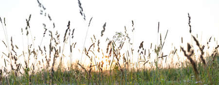 Blurred background image of meadow grass at sunset in summer. beauty in nature. Defocused nature image. Banner. low angle shot.
