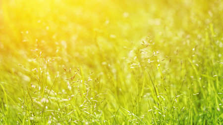 Fresh green grass field on blurred bokeh background close up, beautiful sunlight summer lawn, spring season nature landscape.