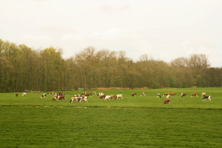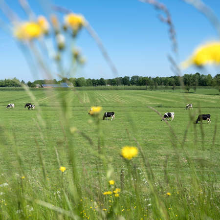 Pasture and cows in the Dutch fields near The Hague. Beautiful rural landscape of the Netherlands.