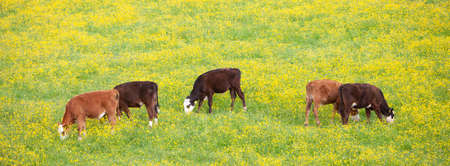 brown and black calves graze in meaedow full of yellow blooming buttercups