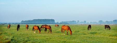 herd of young horses in meadow during sunrise in the netherlands near culemborg