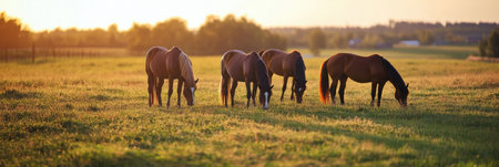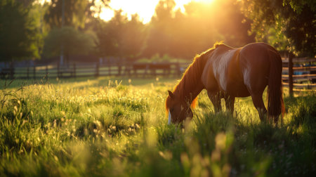 Horses graze peacefully in a lush green pasture under warm golden sunlight, with a soft blurred background enhancing the tranquil rural setting.