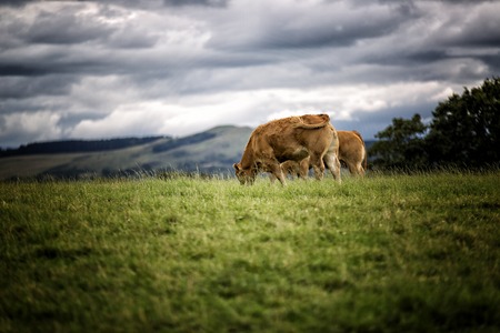 A herd of cows grazing and resting on a pasture in Austria on a cloudy summer day