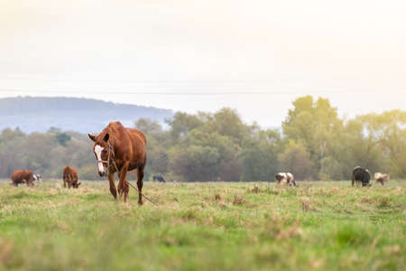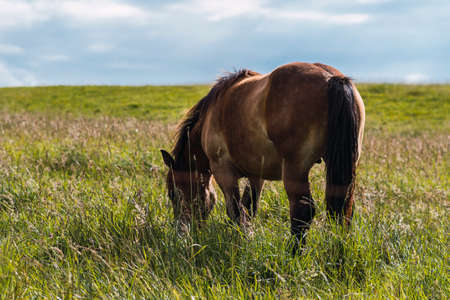 Brown horse grazing in a meadow, beautiful rural landscape with cloudy sky. Stories about rural life in Ukraine