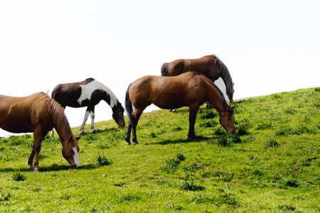 Two brown horses grazing peacefully on a lush green hillside, relishing the tranquility of nature and embodying a serene pastoral scene filled with harmony and beauty